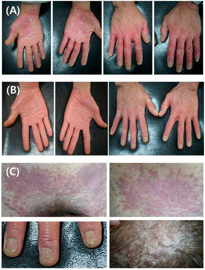 The suspected histopathological diagnosis was psoriasis vulgaris. The patient started treatment with cyclosporine (150 mg/day) and narrow-band ultraviolet B every week for three months. After that, the patient’s skin lesions and pruritus were significantly improved and the patient himself discontinued visiting as an outpatient for treatment. Four months after discontinuation of treatment, he visited as an outpatient due to aggravation of the prior skin lesions and resumed treatment with cyclosporine (100 mg/day). Despite continuous treatment, the hand area deteriorated (Figure 2A) and additional treatment with alitretinoin (30 mg/day) and excimer laser was performed. After 8 months of treatment, partial skin lesions improved, and after ixekizumab was administered to the patient for psoriasis, skin lesions of both upper and lower extremities and pruritus were significantly improved (Figure 2B). While continuing the ixekizumab treatment for 18 months, the patient showed sudden worsening of the skin lesions on the scalp, abdomen, and fingernails (V-shaped nicks) with pruritus (Figure 2C).