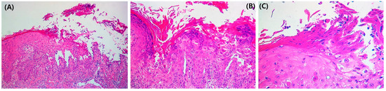 The treatment was changed to guselkumab, after which he improved for 4 months; however, the condition of the skin lesions waxed and waned repeatedly. A punch biopsy was performed on the abdominal lesion. Focal acantholysis was present in the suprabasal layer of the epidermal erosion area (Figure 3A). Dyskeratosis and corps ronds, pyknotic nuclei, and a clear perinuclear halo (Figure 3B) were observed in the epidermis. Corps grain compressed cells with elongated nuclei were seen in the stratum corneum and granular layer (Figure 3C).
