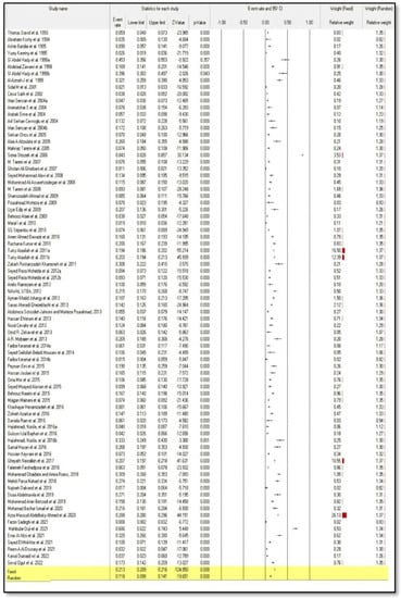 | Turky Ataallah | 2011 | 9610 | Iraq | 2005–2006 | Acute viral hepatitis | Cross-sectional | 1–60 years | Baghdad | 49.5 | 50.5 | 19.4 | [51] |