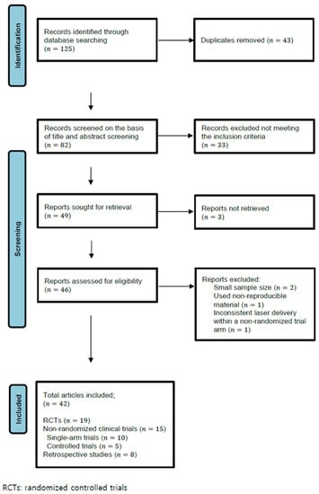 A total of 125 articles were initially identified in the literature search, of which 43 were duplicates and 33 did not meet the inclusion criteria and were thus removed. In the retrieved 46 articles, 4 articles were additionally excluded according to the criteria. A total of 42 articles were finally included: 19 RCTs, 15 non-RCTs (10 single-arm trials, 5 controlled trials), and 8 retrospective studies (Figure 1). A total of 1736 melasma patients were included, whose Fitzpatrick’s skin types consisted of mostly type II-V. Parameters used for LFQSNY varied among studies. The most commonly used spot size was 6–10 mm with a fluence of 0.5–3.8 J/cm2. The number of passes varied from 1 to 10 passes, being most performed in less than 5 passes. Laser treatment sessions were performed usually at intervals of 1–2 weeks with the exception of several studies (especially, studies regarding combination therapy) at intervals of 4 weeks [16,33,37,41]. The time at which efficacy was first evaluated also differed between studies: during the study period, immediately at the end of treatment, 1 to 2 weeks post-treatment, or 1 to 3 months post-treatment. Therefore, direct comparison between heterogeneous studies was difficult, even between those that had the same outcome measures. In addition, validating methods for efficacy differed according to authors. As a subjective outcome measure, the melasma area severity index (MASI) or modified MASI (mMASI) has been frequently adopted. In terms of objective outcome measures, the melanin index (MI) and erythema index (EI) measured from Mexameter® have been frequently used, whereas a few old studies used lightness index (L*I), relative lightness index (RL*I), and color difference (ΔE*ab) using a spectrophotometer. Physician’s Global Assessment (PhGA) and subjective patient satisfaction or patients’ global assessment were also widely adopted indices. The results of the literatures are given in Table 1.