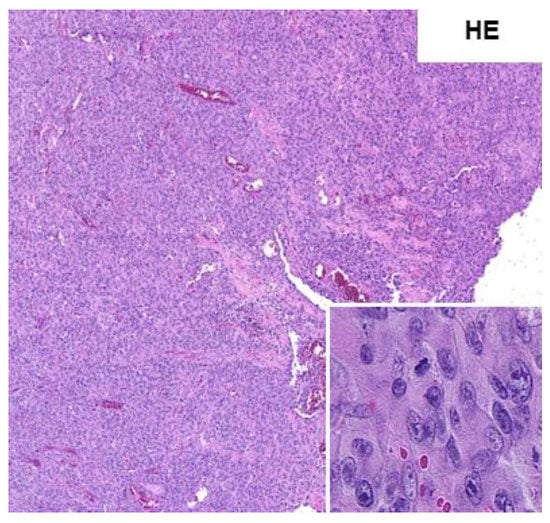 Due to its histological similarity with poorly differentiated carcinoma, it is suggested that epithelioid RMS tumors are diagnosed and treated as an epithelial tumor. Histologically, cells showing a sheet-like growth with prominent nucleoli and a high proliferation rate suggest carcinoma or melanoma cells [,]. The morphological appearance of the cells makes diagnosis difficult, and an accurate morphological and immunhistochemical analysis are required.