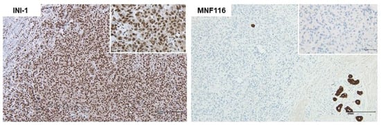 - Zin, A.; Bertorelle, R.; DallÍgna, P.; Manzitti, C.; Gambini, C.; Bisogno, G.; Rosolen, A.; Alaggio, R. Epitheloid rhabdomyosarcoma: A clinicopahtologic and molecular study. Am. J. Surg. Pathol. 2014, 38, 273–278. [Google Scholar] [CrossRef] [PubMed]