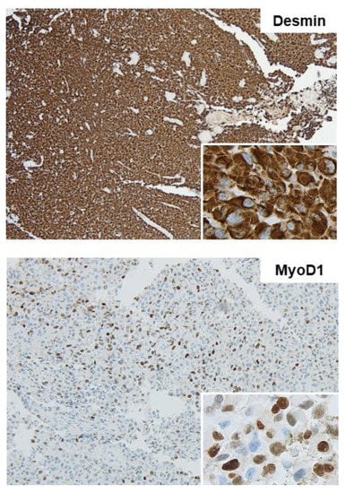In summary, diagnosis of epithelioid RMS can be challenging due to the combination of epithelioid histological features with skeletal muscle differentiation. Thus, immunohistochemical and molecular findings are essential for the final diagnosis of epithelioid RMS, which includes co-expression of Desmin and markers of skeletal muscle differentiation, such as MyoD1.