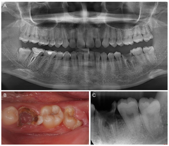 Preoperative examination. (A) A panoramic radiograph and (B) a clinical photograph showing tooth #36 with extensive caries and pulp polyp, and tooth #38 erupted partly. (C) Preoperative periapical radiograph showing tooth #36 with destruction on the floor of the pulp chamber and tooth #38 with completely formed roots.