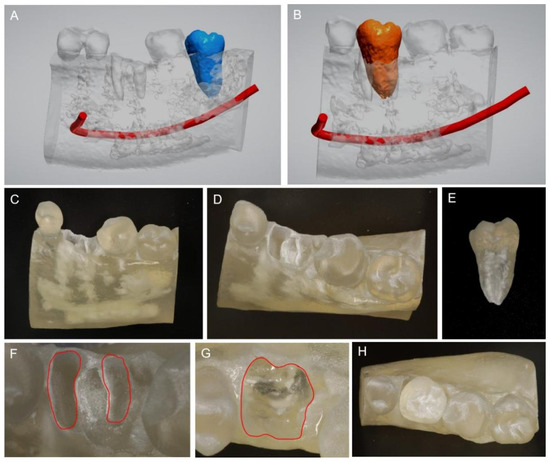 Digital planning and 3D-printed CARP models of the donor tooth and extraction socket. (A) Virtual construction of digital imaging was created using CBCT radiographs and surgical planning software (3 Shape Software, Copenhagen, Denmark). Segmentation of the donor tooth #38 (in blue). (B) Virtual simulation of the donor tooth in its planned position of tooth #36 (in orange). (C,D) The 3D-printed CARP model of the tentative extraction socket of the buccal view (C) and occlusal view (D). (E) The 3D-printed CARP model of the replica donor tooth #38. (F) Double-root outlines of tooth #36 of the tentative extraction socket are shown as a red line. (G) Single-root outline prepared (red line). (H) The replica donor tooth #38 inserted into the replica alveolar socket.