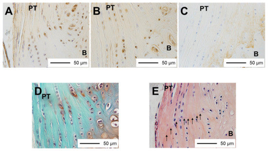 Tissue specimens: (A) PCNA staining, PCNA-positive cells were brown (400×); (B) TUNEL staining, TUNEL-positive cells were brown (400×); (C) type II collagen staining, brown area is type II collagen-stained area (400×); (D) safranin O staining, red area is glycosaminoglycan production area (400×); (E) HE staining, the tidemark is between the calcified and uncalcified fibrocartilage layers (arrows) (400×). PT, patella tendon; B, bone; PCNA, proliferating cell nuclear antigen; TUNEL, terminal deoxynucleotidyl transferase-mediated deoxyuridine triphosphate-biotin nick-end labeling.