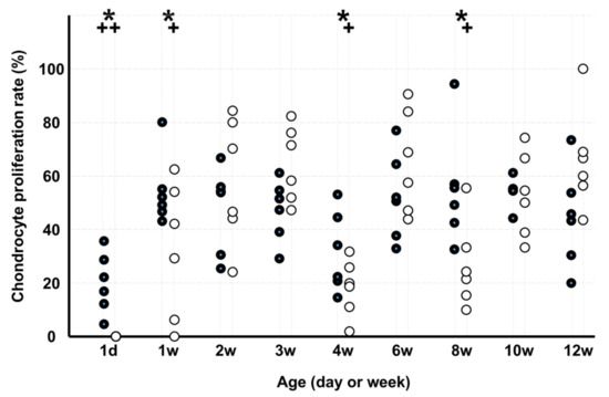 Chondrocyte proliferation rate. Note: * p < 0.05, WD vs. KO (n = 6); + p < 0.05, vs. age of 12 weeks (n = 6); ●: WD; ◯: KO. Some markers may be overlapping.