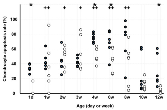 Chondrocyte apoptosis rate. Note: * p < 0.05, WD vs. KO (n = 6); + p < 0.05, vs. age of 12 weeks (n = 6); ●: WD; ◯: KO. Some markers may be overlapping.