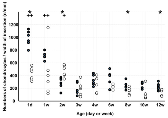 Numbers of chondrocytes per width of insertion. Note: * p < 0.05, WD vs. KO (n = 6); + p < 0.05, vs. age of 12 weeks (n = 6); ●: WD; ◯: KO. Some markers may be overlapping.
