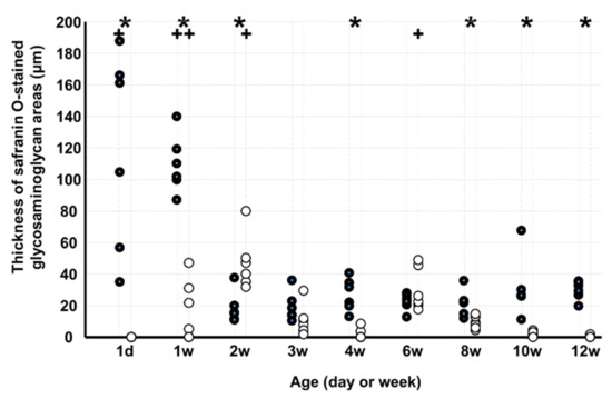 Thickness of safranin O-stained glycosaminoglycan areas. Note: * p < 0.05, WD vs. KO (n = 6); + p < 0.05, vs. age of 12 weeks (n = 6); ●: WD; ◯: KO. Some markers may be overlapping.