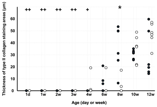 Thickness of type II collagen staining areas. Note: * p < 0.05, WD vs. KO (n = 6); + p < 0.05, vs. age of 12 weeks (n = 6); ●: WD; ◯: KO. Some markers may be overlapping.