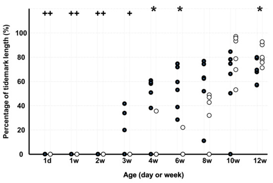 Percentage of the tidemark length. Note: * p < 0.05, WD vs. KO (n = 6); + p < 0.05, vs. age of 12 weeks (n = 6); ●: WD; ◯: KO. Some markers may be overlapping.