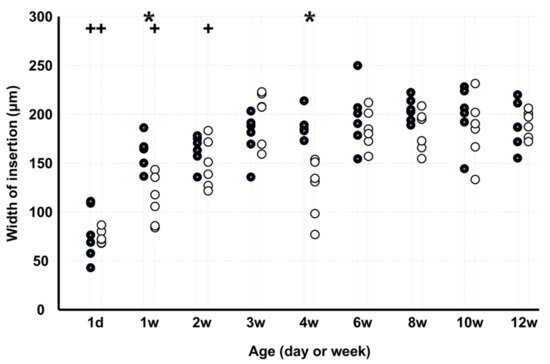 Width of insertion. Note: * p < 0.05, WD vs. KO (n = 6); + p < 0.05, vs. age of 12 weeks (n = 6); ●: WD; ◯: KO. Some markers may be overlapping.