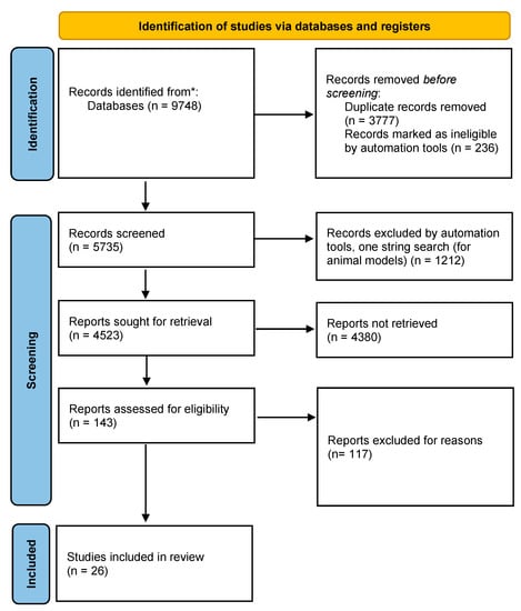 We screened 5735 publications, out of which 143 reports were assessed for eligibility after reading the title and abstract. Finally, 26 studies [,,,,,,,,,,,,,,,,,,,,,,,,,] that met the inclusion criteria and the quality assessment request were included in the analysis.