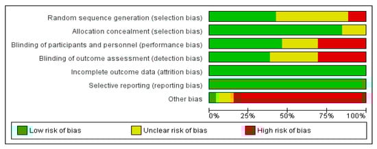 Each study was screened for possible selection, detection, or attrition bias. The studies had a low risk of selection bias if the method used to generate the allocation sequence to conceal allocation to the intervention was clearly described. Otherwise, the risk of selection was unclear. In addition, if the investigators or participants were blinded, the risk for performance was low. In addition, if the outcome assessment was stated as blinded, the risk of detection bias was low, and the risk was unclear if the outcome assessment was not described. We did not identify incomplete outcome data or reporting bias.