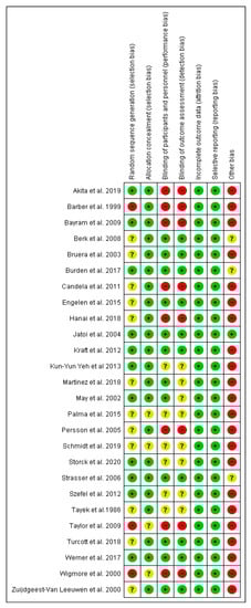 Most of the studies were designed in a randomized fashion and included both a control arm and an experimental arm. However, the experimental arm in most of the studies only included a small number of patients. Some of the patients were lost at follow-up, and others were withdrawn from the studies. Therefore, we considered more than 75% of the included studies to be at a high risk of bias, due to the small number of treated patients with dietary supplements.