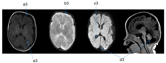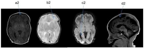 Cranial MRI taken 5 days after birth. T1 weighted imaging (TIW)—coronal section (SE), T2 weighted imaging (T2W)—SE, diffusion-weighted imaging (DWI)—SE, TIW—median sagittal section (SAG). a2: thin layer; b2: white matter has high water content. a2 and b2 indicate signs of premature birth in the brain. c2: occipital cistern was large. d2: extracranial space was widened. c2 and d2 indicate suspected brain dysplasia.