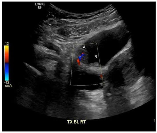 Polypoid lesion along the right anterior superior wall of the urinary bladder (A) 1.5 by 1.5 by 0.9 cm, with the internal flow on the color Doppler imaging suggesting that the mass has a blood flow. Medially, a smaller adjacent polypoid lesion (B) measuring 0.9 cm is noted.