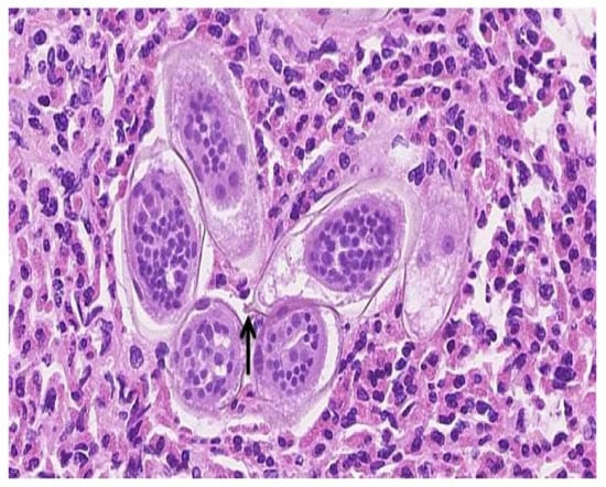 Most cases occur in sub-Saharan Africa [,]. The clinical manifestation of schistosomiasis can be divided into acute and chronic. Acute schistosomiasis (Katayama syndrome), which is a serum sickness-like illness that presents with fever, headaches, urticaria, abdominal pain, and lymphadenopathy, occurs particularly in the non-immune host approximately two to 12 weeks after the significant first exposure to larvae prior to the development of adult worms and egg deposition []. Therefore, praziquantel treatment is not indicated for acute schistosomiasis, as there are not yet any adult worms present to eradicate. The chronic disease is due to a granulomatous inflammatory response against the egg antigens in the host tissue []. Treatment of the chronic disease includes using praziquantel to eradicate the adult worms and cease the production of new eggs. Most of the urinary diseases that are caused by schistosomes gradually regress; however, 10% of those who are infected will develop long-standing complications, such as chronic bladder ulceration, bladder contracture, stricture of the ureters, renal failure, and, ultimately, bladder carcinoma []. Schistosomiasis should be considered in persons who have a history of freshwater exposure in endemic areas. Schistosoma spp. infections can be asymptomatic and lack clinical findings and eosinophilia [].