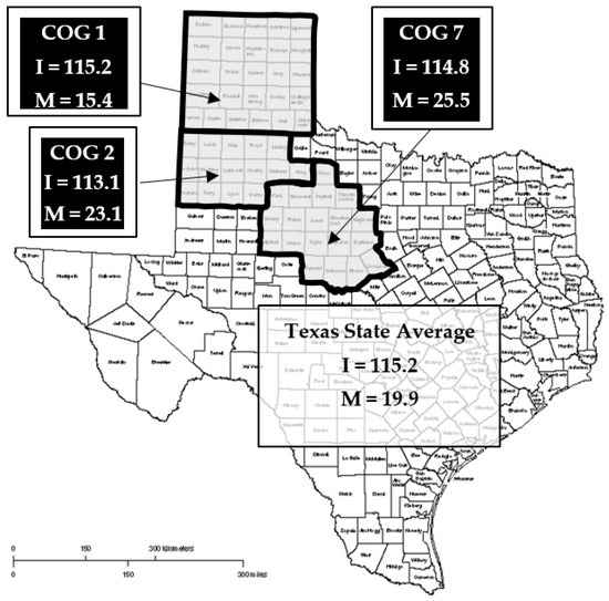 The basis for this study was the comprehensive community outreach program, Access to Breast Care for West Texas (ABC4WT), funded by CPRIT. ABC4WT is an outreach program targeting the underserved (uninsured/under-insured) population of the Texas Panhandle, South Plains, and Central West Texas regions (Council of Government (COGs) 1, 2, and 7, respectively) (Figure 1). This project represents a public–private–community partnership to increase breast cancer screening in the target region. The focus of this study was to identify barriers and outcomes of breast cancer screening (provided at no cost to uninsured women), utilizing the American College of Radiology (ACR) guidelines that recommend annual mammograms for women aged 40 and above, or 10 years younger than the youngest first-degree relative with cancer [18]. Average-risk women under 40 years of age were offered diagnostic mammograms only if they were symptomatic as confirmed by clinical exam. All mammograms were performed at Mammography Quality Standards Act (MQSA)-certified facilities utilizing the ACR reporting lexicon [19,20].