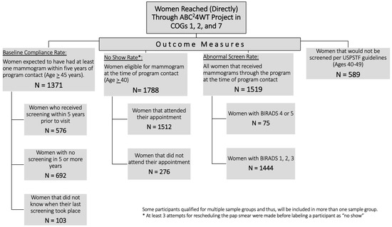 The program reached 2065 women from the three Council of Governments (COGs 1, 2, and 7) covered by the ABC4WT project. Characteristics of the study sample organized by outcome variable are presented in Figure 2. There were 1371 (66.4%) participants above the age of 45, and thus expected to have had at least one mammogram within past five years from the time of contact according to the ACR guidelines; however, approximately half of these participants had not been screened in this time (n = 576). There were 1788 (86.6%) women eligible for a mammogram at the time of the encounter per the ACR guidelines; 276 (15.4%) of these did not keep the appointments despite three attempts at appointment scheduling (“no-show” rate 15.4%). Of the 1519 women who received mammograms at the time of the contact, 75 women (4.94%) had BI-RADS 4 or 5.