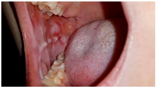 Although intensive chemotherapy (CT) regimens for children now have high efficacy, they are not devoid of side effects. One of the most debilitating for young patients and their caregivers is oral mucositis (OM). The prevalence of OM in children with cancer is between 52% and 80% []. This usually differs in the clinical picture. It can manifest as local irritation, erythema, and inflammation of the oral mucosa; however, it may also progress to generalized and painful erosions or ulcerations, resulting in hampered swallowing, chewing, and speaking [].