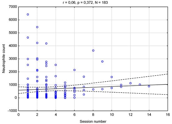 The results of the correlation analysis (p < 0.05) between the number of sessions and the level of neutrophilia are presented in Figure 3.