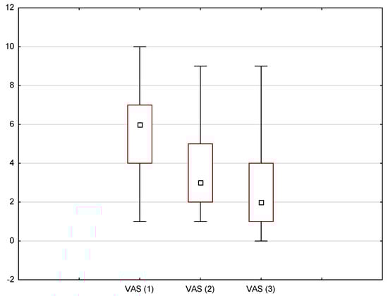 In addition, the Friedman ANOVA test (p < 0.05) was used to demonstrate whether the laser treatment had an effect on pain relief with each consecutive session. The results, presented in Figure 4, indicate that the subsequent measurements on the VAS scale differed from each other with chi2 (N = 39, df = 2) = 55.13, p < 0.001, and that the pain intensity decreased with each laser session.