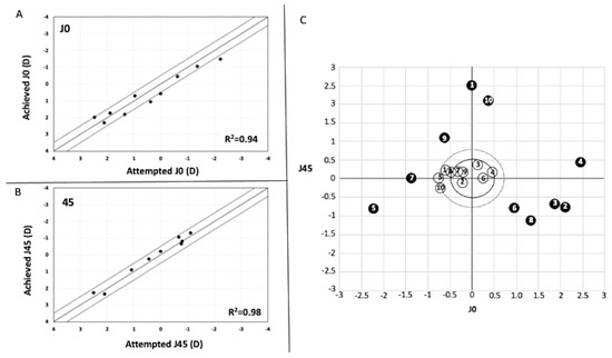The SE decreased from a preoperative value of −2.34 ± 2.03 to −0.99 ± 0.86 at six months after Femto-LASIK (p = 0.01). The refractive cylinder reduced from −3.88 ± 1.00 D preoperatively to −0.93 ± 0.39 six months after Femto-LASIK (p < 0.0001). Figure 3A,B shows the correlation analysis between the targeted versus achieved (predictability) of the astigmatism component (J0 and J45) six months after Femto-LASIK. A total of 7 eyes (70%) and 10 eyes (100%) were within ±0.50 D of the target refraction for J0 (r2 = 0.94) and J45 (r2 = 0.98), respectively. In all cases, the astigmatism components (J0 and J45) significantly moved towards the graph’s origin (0, 0) after Femto-LASIK (Figure 3C). In all cases, the preoperative refractive cylinder was ≥2.50 D (range −2.50 to −5.00). Conversely, postoperatively, the refractive cylinder was ≤1.50 D in all eyes (range −0.50 to −1.50 D) (Figure 3C, dot line circle). Seven eyes (70%) had a postoperative refractive cylinder ≤−1.0 D (Figure 3C black line circle). A bioptic surgery was planned in cases 2 and 4 (Femto-LASIK for cylinder correction, and then three months later, a spherical Implantable Collamer Lens (ICL; STAAR Surgical Inc., Monrovia, CA, USA) was implanted to correct the associated spherical component).