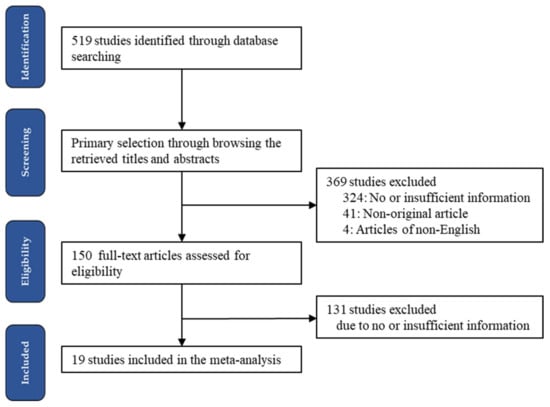 The initial literature search retrieved 519 articles from the database. On primary screening, 369 articles were excluded due to the absence of or insufficient information (n = 324), nonoriginal studies (n = 41), and non-English publications (n = 8). The full text of 150 articles was reviewed, with 131 excluded due to the absence of or insufficient information. Ultimately, therefore, 19 articles were included in the meta-analysis. Detailed information regarding the included and excluded studies is shown in Figure 1 and summarized in Table 1.