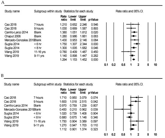 The odds ratios for obesity and overweight were 1.191 (95% CI 1.055–1.344) and 1.098 (95% CI 0.976–1.234), respectively. In the subgroup analysis based on age, obesity/overweight with short sleep duration was significantly prevalent in the <6 and 6–10 years’ subgroups (odds ratio 1.226 (95% CI 1.083–1.387) and 1.341 (95% CI 1.175–1.530), respectively). There was no significant difference between short and long sleep duration in the >10 years’ subgroup. A significant correlation between obesity/overweight and short sleep duration was found in the Asian but not in the North American subgroups (odds ratio 1.161 (95% CI 1.060–1.398) and 1.161 (95% CI 0.964–1.398), respectively). Subsequently, subgroup analysis based on sex was performed. In boys, short sleep duration was significantly correlated with a high occurrence of obesity/overweight (odds ratio 1.294 (95% CI 1.153–1.452)) (Figure 2A). However, in the girls’ subgroup, there was no significant correlation between obesity/overweight and short sleep duration (Figure 2B).