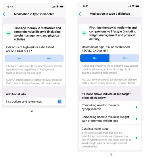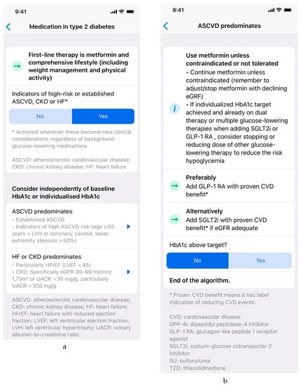 An illustrative usage scenario: (a) first-line therapy is suggested to the user, along with inquiry that enables comorbidity-based treatment individualization (predominating atherosclerotic cardiovascular disease, predominating heart failure, or chronic kidney disease); (b) specific recommendations for patients with predominating atherosclerotic cardiovascular disease are presented to the user. HbA1c: hemoglobin A1C (glycated hemoglobin); eGFR: estimated glomerular filtration rate.
