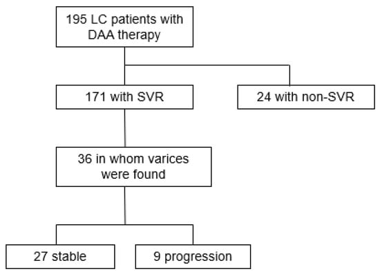 Clinical and therapeutic data were obtained from the medical records of 195 patients with HCV-related LC who received DAA therapy at our hospital between November 2014 and October 2018 (Figure 1). Out of a total of 171 patients with an SVR, we found that 36 patients had either EVs or gastric varices (GVs) before and after the provision of DAA therapy and were therefore included in this study. Follow-up examinations for a patient were stopped if GEVs in the patient had been treated; if the patient had HCC with major portal vein tumor thrombosis of grade ≥ Vp3; if the patient died; or if the patient was no longer seen as an outpatient. The mean follow-up time was 731.4 days (day 105–1617). This study was performed in accordance with the ethical principles stated in the Declaration of Helsinki (as revised in Brazil in 2013) and was approved by the relevant ethics committee. Informed consent was obtained in the form of opt-out. Those who rejected consent were excluded from the study.