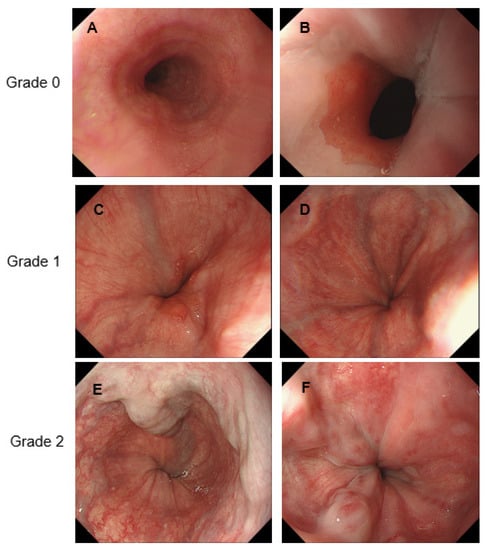 Table 1 shows the characteristics of the patients with LC prior to administration of DAA therapy. Patients included 16 men and 20 women, with a median age of 72 years (range: 56–83 years). DAA therapy was administered as follows: a combination of daclatasvir and asunaprevir was administered to 16 patients; sofosbuvir was administered to 11 patients; a combination of ledipasvir and sofosbuvir was administered to 5 patients; a combination of ombitasvir, paritaprevir, and ritonavir was administered to 1 patient; and a combination of glecaprevir and pibrentasvir was administered to 3 patients. Eight patients had a history of being treated for GEVs to prevent the rupture of GEVs. Six of these patients had undergone endoscopic variceal ligation, one endoscopic injection sclerotherapy, and one balloon-occluded antegrade transvenous obliteration. In these patients, endoscopic findings before DAA treatment did not indicate GEVs that required preventive treatment for GEVs rupture. Twenty patients had a history of being treated for HCC before they received DAA therapy. With respect to the endoscopic findings associated with GEVs, before the administration of DAA therapy, 16 patients had only EVs, 2 patients had only GVs, and 17 patients had both EVs and GVs. Only one patient had no GEVs before receiving DAA therapy. Furthermore, with respect to the form of GEVs, 31 patients had F1 GEVs, 4 patients had F2 GEVs, and no patient had F3 GEVs. Regarding the RC marks and spots, 26 patients had RC0 GEVs, 8 patients had RC1 GEVs, and 1 patient had RC2 GEVs; no patient had RC3 GEVs. With respect to GEV grades, which were determined based on the form of GEVs and the presence of RC marks and spots, 1 patient had grade-0 GEVs, 24 patients had grade-1 GEVs, and 11 patients had grade-2 GEVs. None of the patients had grade-3 disease. Endoscopic images of GEV grade 0–2 were shown in Figure 2.