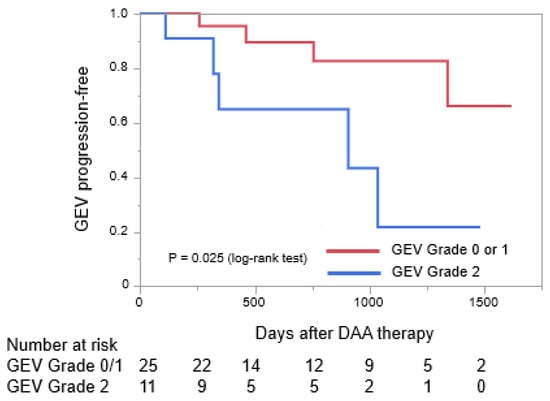 We also investigated the patient risk factors that contributed to the progression of GEVs (Table 3) and found that there were no significant risk factors associated with age, sex, medical history, past history of HCC treatment, and liver function. Although we discovered that the presence of both EVs and GVs, GEVs with forms of grade F2 or higher and GEVs with the RC marks and spots of grades RC1–2 were not significant risk factors, the odds ratio for GEV grades ≥ 2 was 5.83 (p = 0.04). This indicates that having GEVs of grade-2 or higher was a risk factor for the worsening of GEVs after receiving DAA therapy. We then compared the GEV-progression-free period after receiving DAA therapy in the patients with GEVs of grades 0–1 to that in patients with GEVs of grade-2. As shown in Figure 3, patients with GEVs of grade-2 had significantly shorter progression-free periods than patients with GEVs of grades 0–1 (p = 0.025).