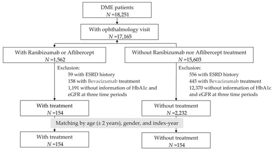 We collected data from 18,251 patients with diabetic macular edema (DME) who had documented visits to CMUH between 2013 and 2019. We excluded 1086 patients without ophthalmology visits. DME patients were split into two groups based on ranibizumab and aflibercept treatment. DME patients with a history of ESRD and bevacizumab treatment, or those without recorded glycated hemoglobin A1c (HbA1c) levels or estimated glomerular filtration rate (eGFR), were excluded. The date of initial treatment was defined as the index date. The details are presented in Figure 1. A treatment patient was matched with a non-treatment DME patient by age (±2 years), gender, and the year of the clinic visit.
