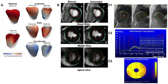 (A) A three-dimensional motion assessment model of the right ventricle in pulmonary hypertension illustrates the regional contributions to survival prediction, reproduced with permission from Dawes et al., published by Radiology, RSNA, 2017 [8]. (B) A representation of manual vs. automated segmentation of three levels using short-axis cine stack left ventricular (LV) volumetric assessment by cardiac magnetic resonance imaging (CMR). (C1) An automated registration followed by Deep-Learning-based contour detection. LV endocardial border (red), LV epicardial border (green), blood pool (white circle) and right ventricular insertion point (blue dot). (C2) The input function derived from the most basal slice using absolute perfusion quantification by Fermi-based deconvolution. (C3) A bullseye plot showing the results of segmental absolute perfusion quantification.