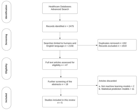 The database search identified 2475 records, of which 18 studies were deemed relevant after screening the titles and abstracts. An assessment of the full texts identified five studies that met the eligibility criteria (Figure 2).