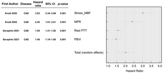 Knott et al. [13] included patients with CAD, of which 4% died, and 14% experienced MACEs during a follow-up period of 1.7 ± 0.5 years. Automatic myocardial blood flow (MBF) and myocardial perfusion reserve (MPR) were the parameters most significantly associated with MACE and death. The risk of MACE was found to be twice as likely for each mL/g−1/min−1 decrease in stress myocardial blood flow (HR 2.14, 95% CI, 1.58–2.90, p < 0.001) and 1 U decrease in MPR (HR 1.74, 95%CI, 1.36–2.22, p < 0.001).