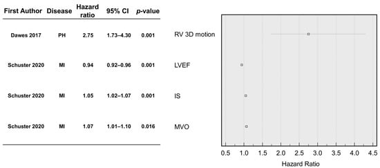Schuster et al. [11] compared manual and commercially available AI methods in MI. During a follow-up period of 1 year, 3% of patients died, and 4% experienced MACE. In a multivariate Cox regression analysis, MACE was significantly associated with the left ventricular ejection fraction (LVEF; HR 0.94, 95%CI 0.92–0.96, p < 0.001), infarction size (IS; HR 1.05, 95%CI 1.02–1.07, p < 0.001), and microvascular obstruction (MVO; HR 1.07, 95%CI 1.01–1.1, p = 0.016) (Figure 4). A strong correlation between the three-dimensional right motion and prognosis in patients with pulmonary hypertension was reported by Dawes et al. [8]. During a follow-up period of 4 ± 1.7 years, 36% of patients died, and a single patient (0.4%) underwent lung transplantation. Three-dimensional patterns of systolic cardiac motion significantly predicted mortality (HR 2.74, 95%CI 1.73–4.34, p < 0.001) [8] (Figure 4).