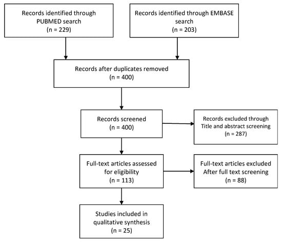 We identified 229 articles from PubMed and 203 articles from EMBASE (Figure 1). After the removal of duplicate articles and the evaluation of titles and abstracts, 113 articles were included. A total of 25 articles remained after the full-text evaluation. Table 1 lists the detailed information of these 25 articles. They are listed in alphabetical order by the name of the first author.