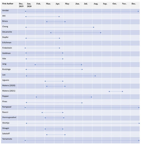 Figure 3 presents the time frame of the included studies. The majority of the studies had a study period of less than 6 months and mostly focused on the first half of 2020. Ten studies had a study period of more than 6 months (40%), and only four studies (16%) had their study period extended to the whole year.