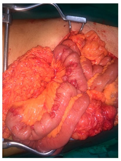 Attenuated familial polyposis (AFAP), is a phenotypic variant of FAP syndrome, characterized by the presence of 10 to 100 synchronous polyps in the large intestine. In classical FAP, there are thousands of polyps, which is why this form is called “attenuated”. AFAP is inherited in an autosomal dominant manner, but APC gene mutations are different from those detected in patients with classic FAP, since the mutations in APC associated with AFAP are mostly detected in three regions of the gene: the 5′ end (the first 5 exons), exon 9, and the distal 3′ end [10,11]. In individuals with mutations in region 1, the average number of adenomas is, in general, higher and more variable compared to individuals with mutations in regions 2 and 3 [12]. AFAP is generally managed with regular screening to detect if and when polyps develop. Screening by colonoscopy has been recommended for affected people starting at age 20 to 25 years. Because individuals with AFAP can also develop duodenal adenomas and other cancers, upper endoscopy is typically recommended starting at age 20 to 30 years, and then continuing every one to three years depending on the number of polyps. The incidence of desmoid tumors (DT) in classic FAP is approximately 10%, but it seems to be lower in AFAP patients [10]. There is also an increased risk of developing colorectal cancer compared to the general population, although the risk is lower compared to FAP patients [13]. In this presenting case, AFAP was confirmed by NGS analysis. Interestingly, numerous GISTs were found in the jejunum. A thorough search in the PubMed database revealed no other published case with the coexistence of attenuated familial polyposis and multiple GISTs. The combination of these two entities (AFAP and GISTs) is extremely rare and is a challenge to deal with properly.