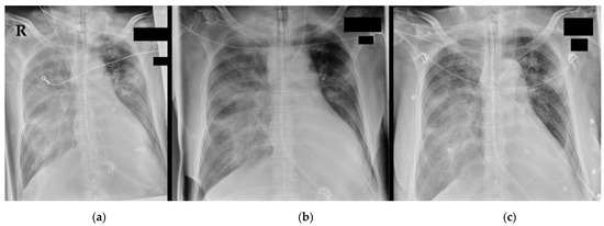 Chest X-rays (Figure 1) showed bilateral consolidations compatible with pneumonic infiltration, with a progressive dynamic over two days’ time. A computed tomography (CT) scan (+ venous contrast medium) of the head, thorax, and abdomen revealed no further acute pathology apart from bilateral pleural effusions (up to 9 cm) and the known bronchial carcinoma (around 4 cm in diameter) of the left upper lobe. Laboratory values are presented in Table 1. In brief, creatinine values were initially within the residual range (no acute kidney injury), a troponin-T amount of 207 ng/L was regredient in the further workup, and infection markers were elevated with an initial C-reactive protein (CRP) amount of 20 mg/dL, rising to a maximum of 23 mg/dL, but eventually falling to 17 mg/dL (procalcitonin rising to a maximum of 3 ng/mL, and interleukin-6 following the dynamics of the CRP). A urine test showed no signs of urinary tract infection. Routine PCR testing delivered multiple negative results for SARS-CoV-2 and influenza but a positive test for RSV (Ct 17.8 at admission, 18.2 on day 2). Blood and urine cultures were still negative 14 days after collection.