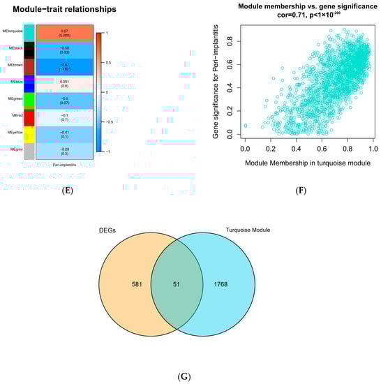 For example, WGCNA [] may be generated to identify gene modules, clinical characteristics (such as the severity of the illness), and the core genes included inside each module. It is also possible to build a non-coding RNA co-expression network as well as the miRNA and lncRNA networks. At present, there are few kinds of studies that research the pathogenesis of PI in this way. Yang Li et al. [] believed that GSK3B and Mir-1297 might have a major impact on the immune microenvironment and pathogenesis of PI using WGCNA. To obtain a deeper understanding of co-expression in PI, we performed the WGCNA in this study to uncover the processes behind novel biomarkers of PI.