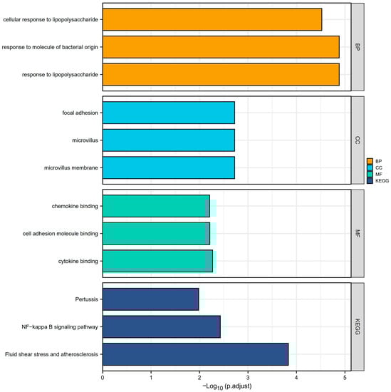 GO enrichment and KEGG analyses. The plot for the top 3 terms of GO enrichment and KEGG analyses. (Abbreviations: GO, Gene Ontology; KEGG, Kyoto Encyclopedia of Genes and Genomes; BP, biological process; CC, cellular component; MF, molecular function).