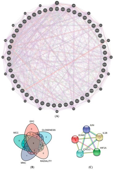 PPI network. (A) 51 crucial common genes in PPI network. (B) Venn diagram displaying the intersection of five algorithms in Cytohubba with the top 10 genes (EPC, MNC, MCC, Closeness, and Radiality). (C) Top 5 hub genes were predicted by the STRING database. (Abbreviations: PPI, protein–protein interaction; MCC, Maximal Clique Centrality; EPC, Edge Percolated Component; MNC, Maximum Neighborhood Component).