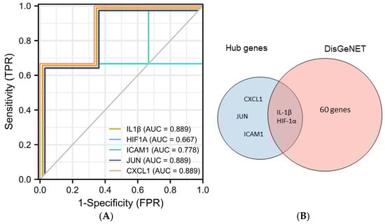 Validation of hub genes. (A) Predicted ROC curves of hub genes based on GSE178351. (B) Venn diagram of intersecting genes of top 5 genes and PI-related genes from the DisGeNET database.