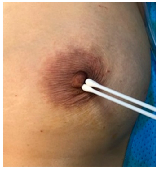 Preoperative antibiotic prophylaxis with 2 g of a first-generation cephalosporin (cefazedone, Yooyoung Pharmaceutical Co., Jincheon, South Korea) was administered intravenously at least 30 min before surgery. For each patient, disinfection of the chest wall and nipple/areola area with povidone-iodine solution was performed. Gentle swabbing was performed on the nipple/areolar area using a dry cotton swab before mastectomy (Figure 1). We collected 220 swabs and sent them for bacterial culture, after which reconstructive surgery was performed.
