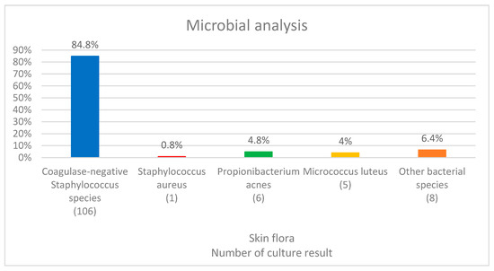 Based on the culture results of the post-disinfection swabs, 125 of the 220 patients (56.8%) yielded positive results for the nipple. A total of 106 patients had coagulase-negative Staphylococcus species (CoNS) (86 patients with S. epidermidis (68.8%), 6 with S. hominis (4.8%), 5 with S. lugdunensis (4%), 3 with S. warneri (2.4%), and 5 with other S. spp. (4%)), 1 patient had S. aureus, 6 patients had Propionibacterium acnes (4.8%), 5 patients had Micrococcus luteus (4%), and 8 patients had other bacterial spp. (6.4%; Figure 2).